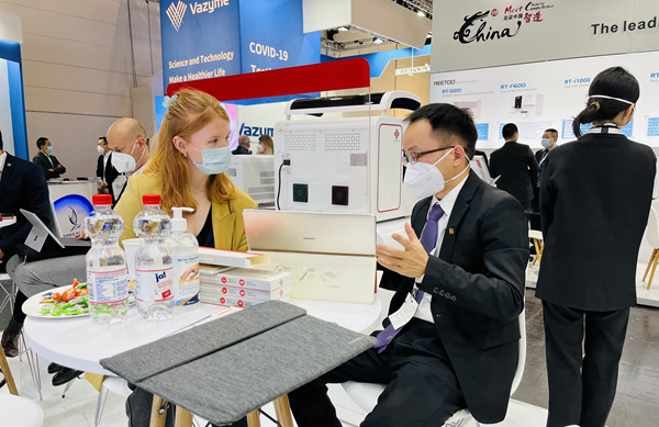 在BB贝博艾弗森展台,“全自动解决方案”“半自动解决方案”“新冠整体解决方案”,以最大程度满足不同国家和地区客户、不同应用场景检测需求的特点,获得了众多来访国际客户的好评。尤其是iPonatic四通道产品,以其便捷、易操作、检测时间快、检测项目多等优势吸引了会场一大波新老“粉丝”的目光。